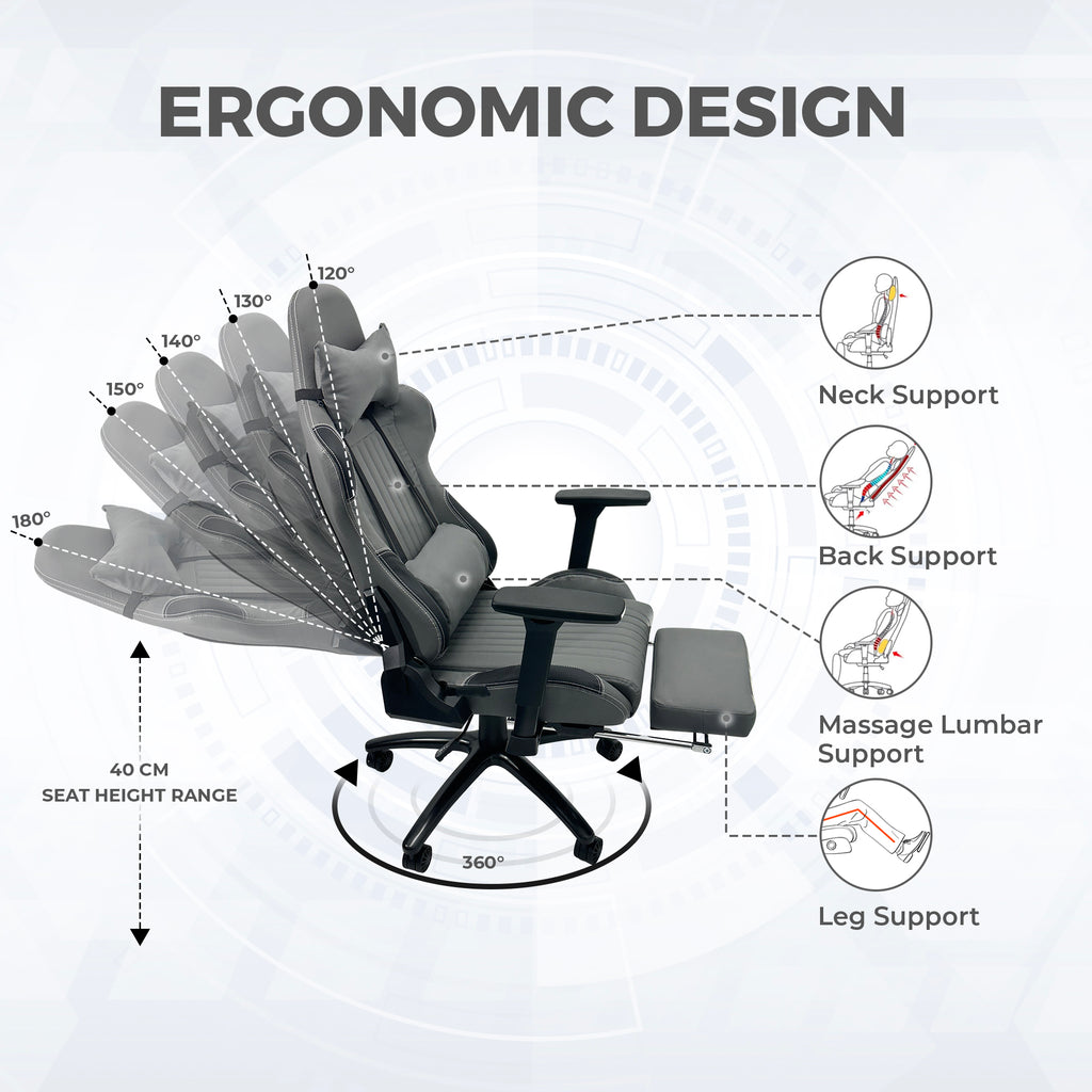 【Multi-Purpose】Ergonomic Gaming Chair with Massage Lumbar Support is designed putting body structure into full consideration, hence the body hugging design. The 120mm thick seat is made of soft and high-density sponge filling covered with a soft thick skin-friendly UK Fire Resistant Leather for your comfort irrespective of how long you sit on it, you will be comfortable. The Ergonomic Gaming and Office Chair is exquisitely fit for use in the office and for a superb Gaming experience for gamers with taste.