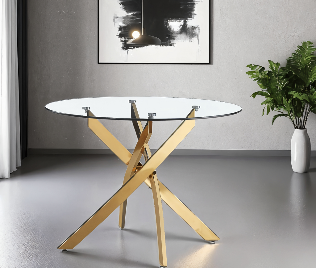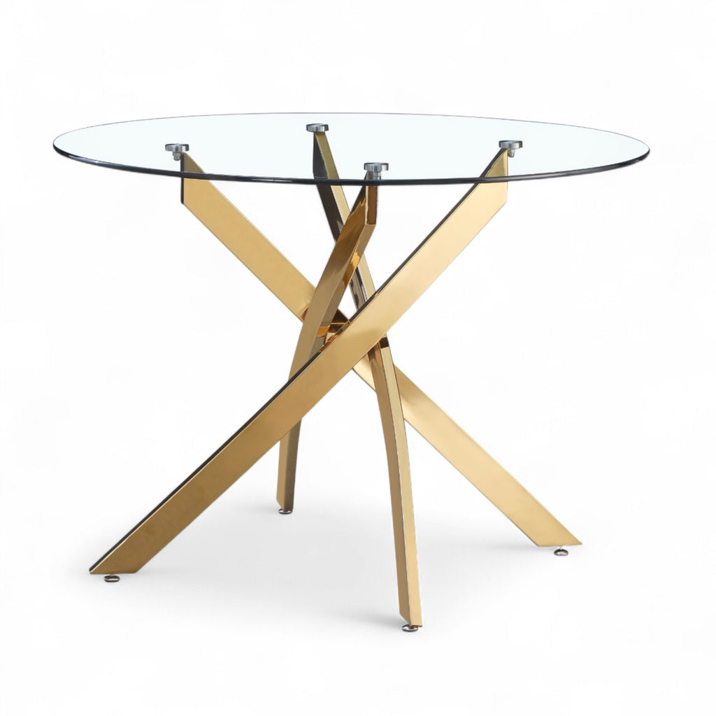 - MODERN ROUND DINING TABLE SET FOR 4 Stylish 100cm tempered glass dining table with gold-plated chrome legs, paired with four contemporary Ravello faux leather dining chairs – the perfect centrepiece for modern kitchens and dining rooms.