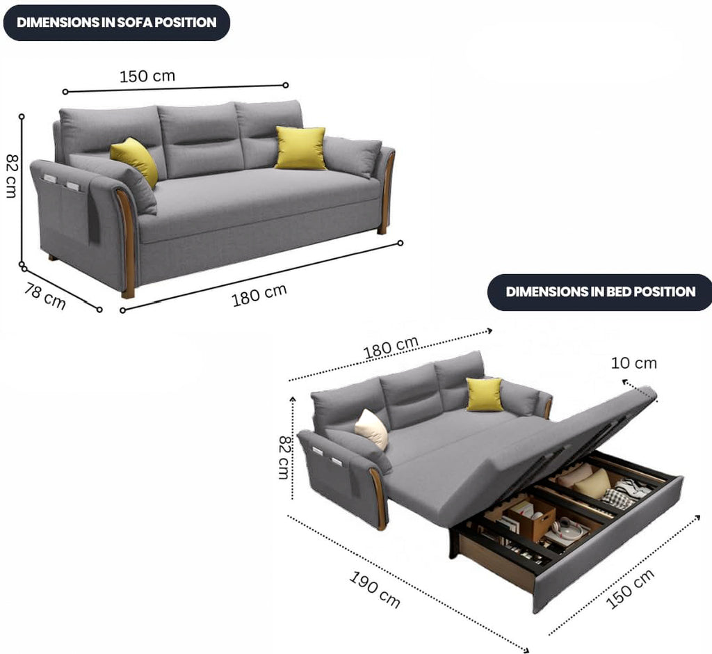 CONVERTIBLE KING SIZE SOFA BED / 3-SEATER SOFA BEDPull out sofabed is Spacious Convertible Sofa Bed with Storage, upholstered in soft, skin-friendly cotton linen. Features a hidden storage compartment and side pockets, perfect for keeping personal items organized. Armrest-to-armrest width: 180cm; Length in sofa bed position: 190cm; Length in sofa position: 78cm.